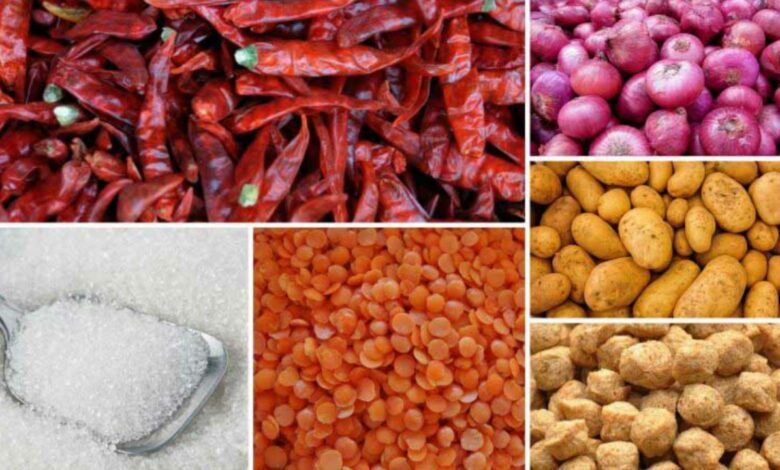 காய்ந்த மிளகாய் (ஒரு கிலோகிராம்) 120 ரூபா 1380 ரூபா உள்ளூர் சம்பா (ஒரு கிலோகிராம்) 11 ரூபா 199 ரூபா வெள்ளை சீனி (ஒரு கிலோகிராம்) 7 ரூபா 210 ரூபா பெரிய வெங்காயம் (ஒரு கிலோகிராம்) 10 ரூபா 119 ரூபா நெத்தலி (ஒரு கிலோகிராம்) 25 ரூபா 1100 ரூபா கடலை (ஒரு கிலோகிராம்) 15 ரூபா 555 ரூபா உள்ளூர் உருளைக்கிழங்கு (ஒரு கிலோகிராம்) 10 ரூபா 270 ரூபா டின் மீன் (425 கிராம்) 10 ரூபா 520 ரூபா கடலைப் பருப்பு 7 ரூபா 298 ரூபா வெள்ளைப்பூடு (ஒரு கிலோகிராம்) 25 ரூபா 450 ரூபா